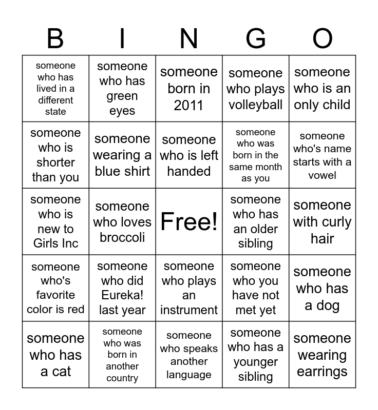 This bingo card has a free space and 24 words: someone who did Eureka! last year, someone who was born in another country, someone who is left handed, someone who has a cat, someone who is an only child, someone who has lived in a different state, someone who is shorter than you, someone who has green eyes, someone who has an older sibling, someone who plays an instrument, someone who was born in the same month as you, someone who is new to Girls Inc, someone who you have not met yet, someone who has a dog, someone wearing a blue shirt, someone who has a younger sibling, someone with curly hair, someone born in 2011, someone who's name starts with a vowel, someone who loves broccoli, someone wearing earrings, someone who's favorite color is red, someone who plays volleyball and someone who speaks another language.