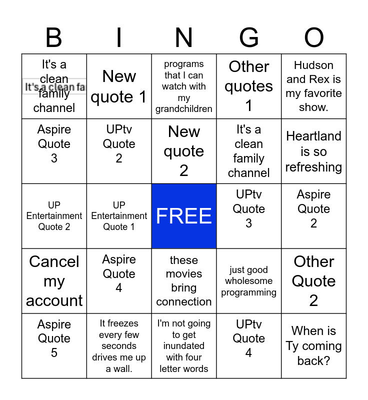 This bingo card has 1 images, a free space and 29 words: Aspire Quote 5, I feel less alone, UP Entertainment Quote 1, It brings hope and joy to me, It's a clean family channel, programs that I can watch with my grandchildren, UPtv Quote 2, Aspire Quote 4, UPtv Quote 3, It freezes every few seconds drives me up a wall., Aspire Quote 2, When is Ty coming back?, I'm not going to get inundated with four letter words, UPtv Quote 4, Heartland is so refreshing, UPtv Quote 1, these movies bring connection, Cancel my account, Hudson and Rex is my favorite show., UP Entertainment Quote 2, just good wholesome programming, Aspire Quote 1, It's a clean family channel, Aspire Quote 3, Other quotes 1, New quote 1, Other Quote 2, New quote 2 and Last quote really it is the last one.