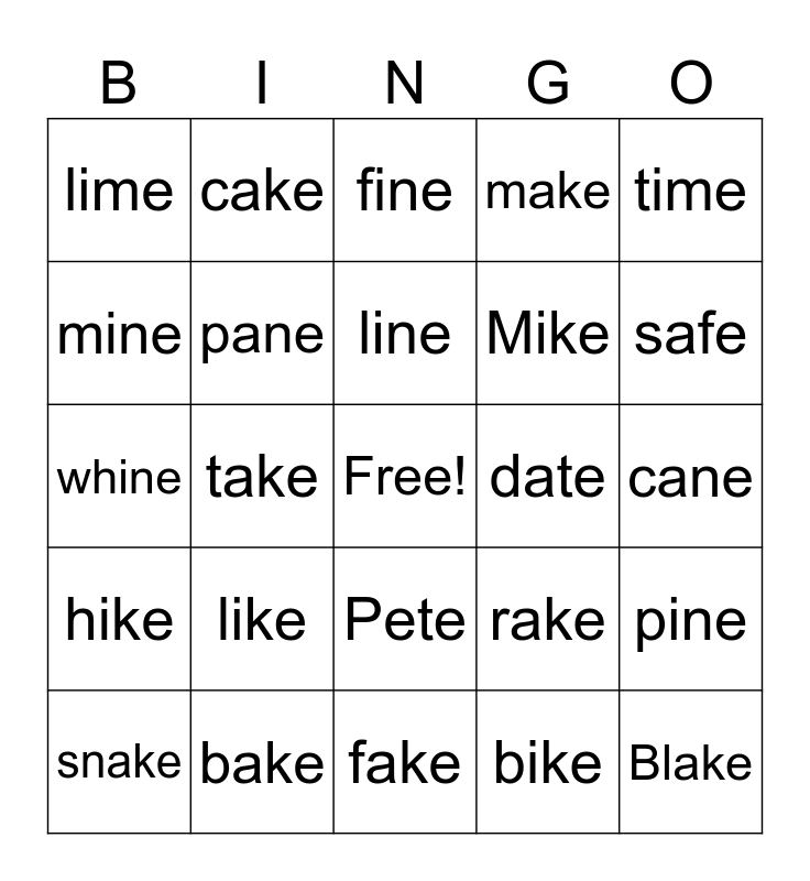 This bingo card has a free space and 24 words: like, bake, line, snake, time, lime, mine, cake, date, Pete, Mike, whine, rake, pine, pane, bike, cane, fine, safe, take, Blake, hike, make and fake.