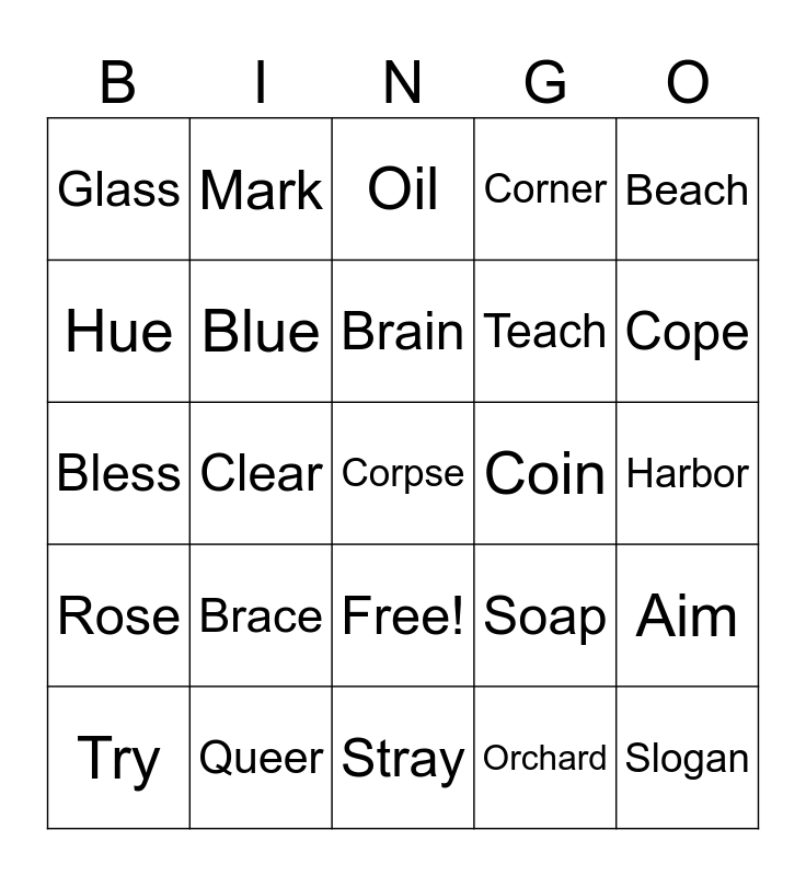 This bingo card has 26 words: Free!, Orchard, Brain, Queer, Beach, Glass, Hue, Mark, Harbor, Soap, Teach, Bless, Aim, Try, Clear, Scout, Corner, Rose, Oil, Corpse, Cope, Stray, Coin, Brace, Blue and Slogan.