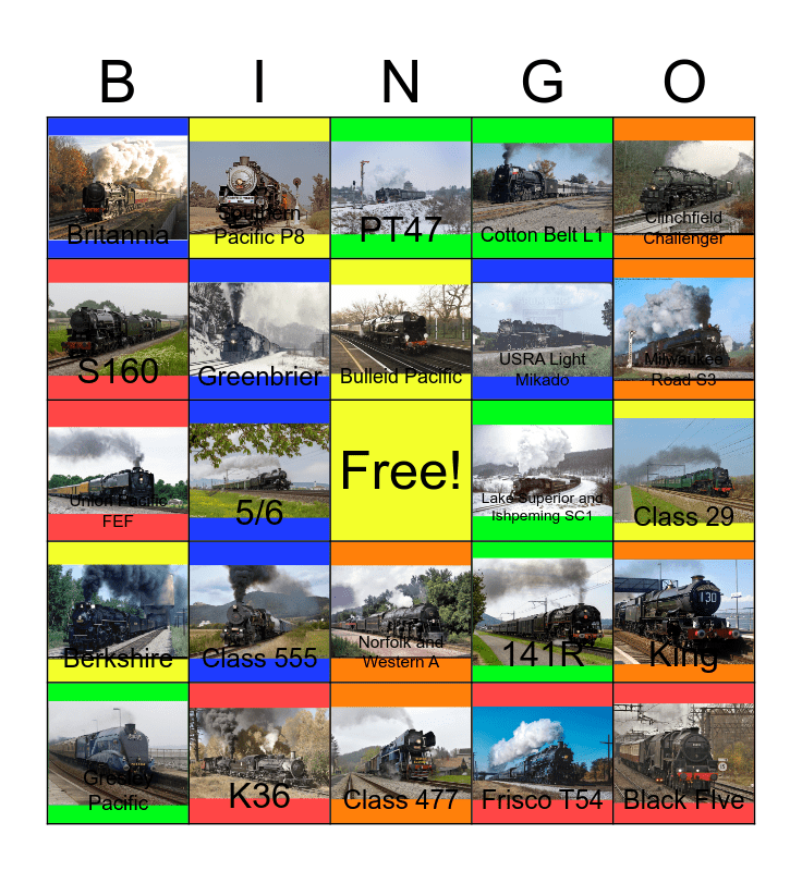 This bingo card has 24 images, a free space and 24 words: Class 555, K36, Bulleid Pacific, Gresley Pacific, Clinchfield Challenger, Britannia, S160, Southern Pacific P8, Lake Superior and Ishpeming SC1, Norfolk and Western A, USRA Light Mikado, Union Pacific FEF, 141R, King, Greenbrier, Frisco T54, Class 29, PT47, Milwaukee Road S3, 5/6, Black FIve, Berkshire, Cotton Belt L1 and Class 477.