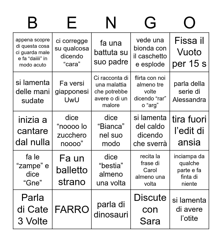 This bingo card has a free space and 24 words: Parla di Cate 3 Volte, Fa un balletto strano, Ci racconta di una malattia che potrebbe avere o di un malore, Discute con Sara, Fissa il Vuoto per 15 s, appena scopre di questa cosa ci guarda male e fa “daiiii” in modo acuto, ci corregge su qualcosa dicendo “cara”, fa una battuta su suo padre, si lamenta del caldo dicendo che sverrà, tira fuori l’edit di ansia, inizia a cantare dal nulla, Fa versi giapponesi UwU, recita la frase di Carol almeno una volta, inciampa da qualche parte e fa finta di niente, si lamenta delle mani sudate, FARRO, parla di dinosauri, vede una bionda con il caschetto e esplode, parla della serie di Alessandra, fa le “zampe” e dice “Gne”, dice “noooo lo zucchero noooo”, dice “bestia” almeno una volta, flirta con noi almeno tre volte dicendo “rar” o “arg” and si lamenta di avere l’otite.