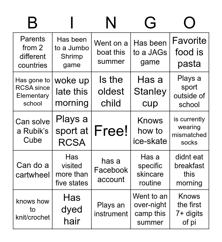 This bingo card has a free space and 97 words: Traveled outside the country this summer, Has a sibling that goes to RCSA, Speaks more than one language, Plays a sport at RCSA, has lived in a different state, ate pancakes this morning for breakfast, Has a pet other than a dog or cat, Has a summer birthday, Loves to, paint, Has seen a musical, Has been camping, Went to a concert this summer, Can do a cartwheel, Has the same birth month as you, Parents from 2 different countries, Favorite food is pasta, Likes to go running, Named after a family member, Made their bed this morning, Wants to join the military, Has seen all of the Harry Potter movies, Has 1k on TikTok, Had a job this summer, Is a middle child, Is the oldest child, knows how to knit/crochet, didnt eat breakfast this morning, Can do a backflip, Favorite food is sushi, woke up late this morning, Has been to a JAGs game, Likes to go fishing, is left-handed, Plays an instrument, has a Facebook account, owns Crocs, Wears socks to bed, knows how to code, Can solve a Rubik’s Cube, Has the same zodiac sign as you, is currently wearing mismatched socks, Likes pineapple on pizza, Went to an over-night camp this summer, Has visited more than five states, Currently has over 100 unread messages, Never got Covid, Is in a club at RCSA, Listens to K-Pop, Went on a cruise this summer, Has never been on a rollercoaster, Prefers XBOX to Playstation, Is new to RCSA, Had spaghetti for dinner last night, Read a book this summer, Has a Winter birthday, Loves to cook, Has been to a Jumbo Shrimp game, Listens to country music, Owns merch from their favorite artist, Has a picture of their pet as their lockscreen, Has met a famous person, Has ever been to CA or NY, Wears contacts, Played golf this summer, Hates Ranch, Has been skiing, Has more than 2 food apps, Has seen all of the Fast & Furious movies, Has dyed hair, Has a Stanley cup, Is the youngest child, Is an only child, Taylor Swift is their favorite artist, Drank coffee or an energy drink today, Has a cracked phone screen, Likes olives, Has played Fortnite this week, Knows how to ice-skate, Likes to dance, Has a tapestry or flag on their wall, Plays a sport outside of school, has a Pinterest account, owns a pair of Jordans, Visited a different FL city this summer, knows how to fold a fitted sheet, Knows the first 7+ digits of pi, Has gum in their backpack, Watched an entire TV series this summer, Brought a PB&J for lunch, Went on a boat this summer, Has ever been to Texas, Has none of their apps in folders, Has a specific skincare routine, Has gone to RCSA since Elementary school, Goes by their middle name and Got a new backpack for this year.