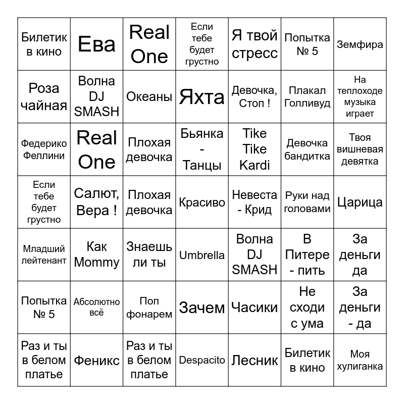 This bingo card has 79 words: Океаны, Абсолютно всё, Real One, Не сходи с ума, Зачем, Под фонарем, За деньги да, По барам, В Питере - пить, Раз и ты в белом платье, Руки над головами, Чужие губы, Если тебе будет грустно, Билетик в кино, Летай со мной, Попытка № 5, Как Mommy, Плохая девочка, Между нами любовь, Федерико Феллини, Волна DJ SMASH, Я твой стресс, Яхта, Роза чайная, Земфира, Лесник, Феникс, Despacito, Homay, Букет, Океаны, не представляешь, Салют, Вера !, Красиво, Твоя вишневая девятка, На теплоходе музыка играет, Ничего не говори, Отпусти меня, Umbrella, Плакал Голливуд, Невеста - Крид, Часики, Моя хулиганка, Люби меня люби, Знаешь ли ты, Ева, Царица, Младший лейтенант, Седая ночь, Веночек, Девочка бандитка, Девочка, Стоп !, Tike Tike Kardi, Бродяга, Летай Со мной в темноте, Абсолютно всё, Попытка № 5, Не сходи с ума, Билетик в кино, Бьянка - Танцы, Волна DJ SMASH, Асфальт, Моя хулиганка, По барам, В Питере - пить, Как Mommy, Руки над головами, Поп фонарем, Яхта Парус, Real One, Если тебе будет грустно, Федерико Феллини, Раз и ты в белом платье, Зачем, Чужие губы, Плохая девочка, Между нами любовь, За деньги - да and Марджанджа.