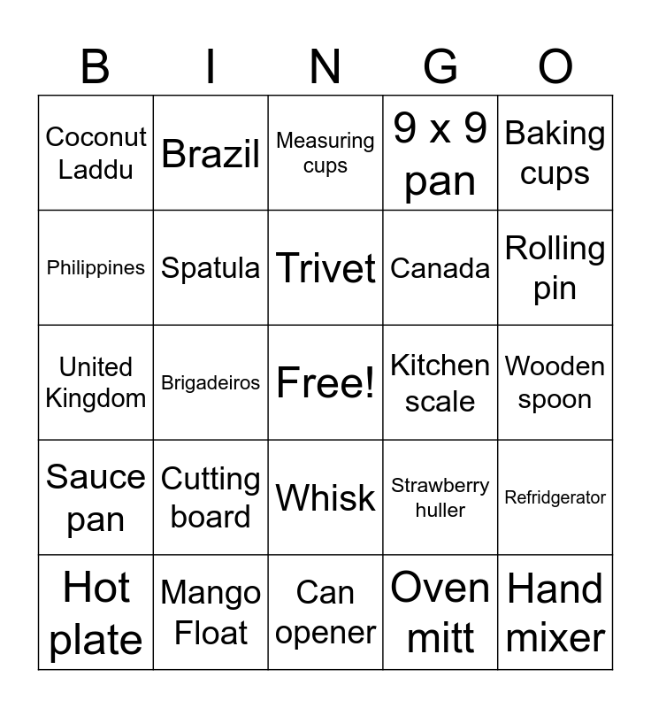 This bingo card has a free space and 30 words: Mango Float, Eton Mess, Brigadeiros, Nanaimo Bars, Coconut Laddu, Measuring cups, Spatula, Whisk, Kitchen scale, Can opener, Wooden spoon, Hand mixer, Oven mitt, Measuring spoons, Rolling pin, Mixing bowl, Strawberry huller, Sauce pan, Cutting board, Baking cups, United Kingdom, India, Brazil, Canada, Philippines, 9 x 9 pan, Refridgerator, Hot plate, Trivet and Offset spatula.