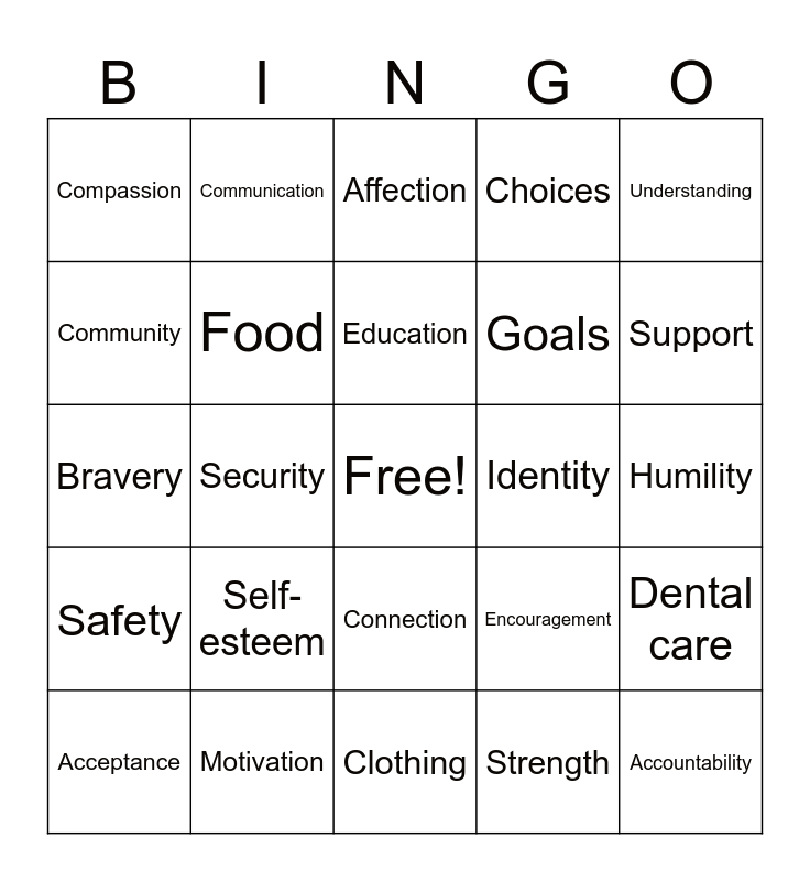 This bingo card has a free space and 75 words: Confidence, Opportunities, Affection, Creativity, Happiness, Courage, Positive Selftalk, Wisdom, Language, Freedom, Play, Friends, Education, Community, Stability, Security, Healthcare, Accountability, Attention, Understanding, Love, Bravery, Food, Communication, Choices, Water, Emotional wellness, Peace, Cultural teachings, Heritage, Truth, Kindness, Empathy, Encouragement, Support, Goals, Nutrition, Equality, Humility, Strength, Family, Gratitude, Guidance, Patience, Belonging, Praise, Acceptance, Compassion, Respect, Learning, Boundaries, Connection, Responsibility, Hugs, Values, Resilience, Honesty, Physical wellness, Shelter, Structure, Self-esteem, Care, Beliefs/Religion, A Voice, Fairness, Identity, Loyalty, Routine, Independence, Dental care, Safety, Motivation, Mental wellness, Clothing and Spiritual wellness.