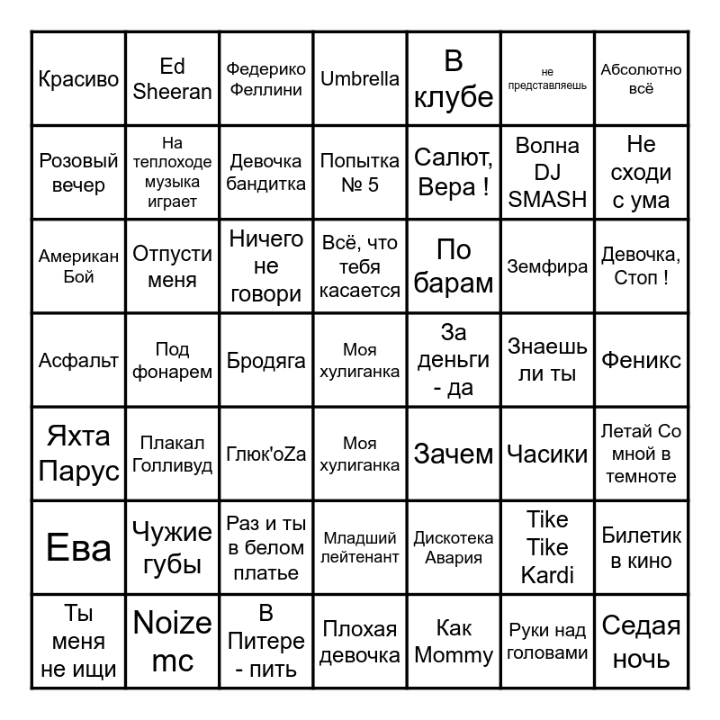 This bingo card has 63 words: Белая ночь, Феникс, Твои глаза, Земфира, Глюк'oZa, Ты меня не ищи, Ed Sheeran, Венера Юпитер, Розовый вечер, Noize mc, Всё, что тебя касается, Дискотека Авария, Американ Бой, В клубе, Океаны, не представляешь, Салют, Вера !, Красиво, Твоя вишневая девятка, На теплоходе музыка играет, Ничего не говори, Отпусти меня, Umbrella, Плакал Голливуд, Невеста - Крид, Часики, Моя хулиганка, Люби меня люби, Знаешь ли ты, Ева, Царица, Младший лейтенант, Седая ночь, Веночек, Девочка бандитка, Девочка, Стоп !, Tike Tike Kardi, Бродяга, Летай Со мной в темноте, Абсолютно всё, Попытка № 5, Не сходи с ума, Билетик в кино, Бьянка - Танцы, Волна DJ SMASH, Асфальт, Моя хулиганка, По барам, В Питере - пить, Как Mommy, Руки над головами, Под фонарем, Яхта Парус, Real One, Если тебе будет грустно, Федерико Феллини, Раз и ты в белом платье, Зачем, Чужие губы, Плохая девочка, Между нами любовь, За деньги - да and Марджанджа.
