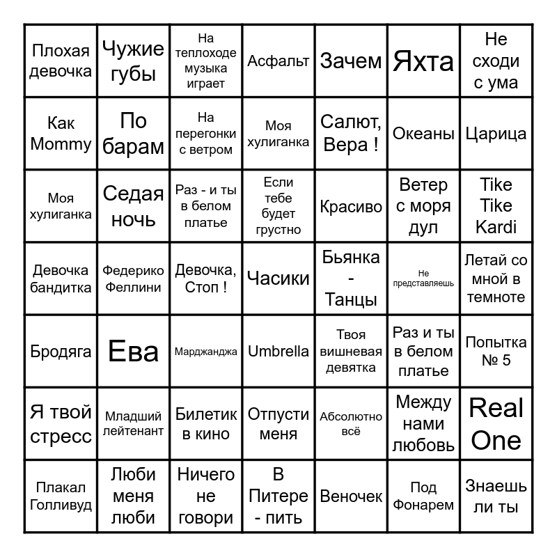 This bingo card has 49 words: Между нами любовь, Океаны, Веночек, Федерико Феллини, Раз - и ты в белом платье, Летай со мной в темноте, Чужие губы, Ничего не говори, Яхта, Umbrella, Не сходи с ума, Асфальт, Ветер с моря дул, Красиво, Младший лейтенант, Не представляешь, Как Mommy, Царица, Real One, Зачем, Салют, Вера !, Девочка, Стоп !, Плохая девочка, По барам, Плакал Голливуд, На перегонки с ветром, Tike Tike Kardi, Люби меня люби, Если тебе будет грустно, Седая ночь, Знаешь ли ты, Бьянка - Танцы, Я твой стресс, Билетик в кино, Девочка бандитка, Твоя вишневая девятка, Раз и ты в белом платье, Попытка № 5, Моя хулиганка, Марджанджа, Отпусти меня, Бродяга, Часики, В Питере - пить, Моя хулиганка, На теплоходе музыка играет, Абсолютно всё, Ева and Под Фонарем.