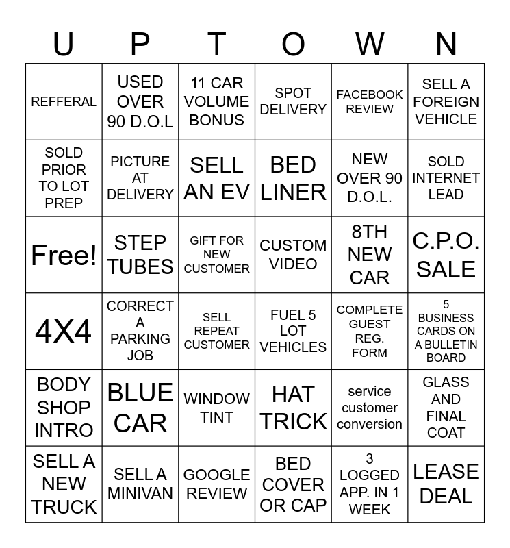 This bingo card has 36 words: HAT TRICK, WINDOW TINT, BED COVER OR CAP, SOLD PRIOR TO LOT PREP, 4X4, CUSTOM VIDEO, PICTURE AT DELIVERY, GOOGLE REVIEW, FACEBOOK REVIEW, service customer conversion, SOLD INTERNET LEAD, SPOT DELIVERY, GLASS AND FINAL COAT, STEP TUBES, BED LINER, REFFERAL, BODY SHOP INTRO, 8TH NEW CAR, Free!, 11 CAR VOLUME BONUS, GIFT FOR NEW CUSTOMER, CORRECT A PARKING JOB, FUEL 5 LOT VEHICLES, SELL REPEAT CUSTOMER, COMPLETE GUEST REG. FORM, USED OVER 90 D.O.L, NEW OVER 90 D.O.L., SELL A MINIVAN, SELL AN EV, SELL A FOREIGN VEHICLE, LEASE DEAL, SELL A NEW TRUCK, 5 BUSINESS CARDS ON A BULLETIN BOARD, C.P.O. SALE, BLUE CAR and 3 LOGGED APP. IN 1 WEEK.