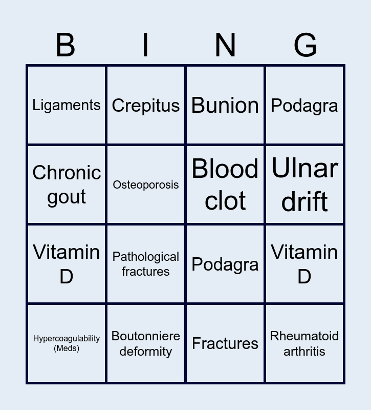 This bingo card has 61 words: Free!, Cushion the joints, Osteoarthritis, Rheumatoid arthritis, Kyphosis, Crepitus, Blood clot, Calcium, Vitamin D, Shellfish, Podagra, Fatty fish, Osteoporosis, Fractures, Muscles to bones, Ligaments, Hypercoagulability (Meds), Chronic gout, Acute gout, Ulnar drift, Boutonniere deformity, Bunion, Swan neck deformity, Venous stasis, Endothelial damage, Gout, Estrogen, Tophi, Pathological fractures, Dancing, Cushion the joints, Osteoarthritis, Rheumatoid arthritis, Kyphosis, Crepitus, Blood clot, Calcium, Vitamin D, Shellfish, Podagra, Fatty fish, Osteoporosis, Fractures, Muscles to bones, Ligaments, Hypercoagulability (Meds), Chronic gout, Acute gout, Ulnar drift, Boutonniere deformity, Bunion, Swan neck deformity, Venous stasis, Endothelial damage, Gout, Estrogen, Tophi, Pathological fractures, Dancing, Swelling and Infection.