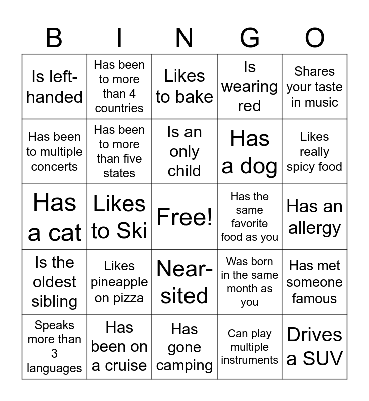 This bingo card has a free space and 24 words: Speaks more than 3 languages, Likes pineapple on pizza, Is an only child, Can play multiple instruments, Shares your taste in music, Is left-handed, Has been to more than 4 countries, Likes to bake, Has the same favorite food as you, Has an allergy, Has a cat, Has been to more than five states, Was born in the same month as you, Has met someone famous, Has been to multiple concerts, Has been on a cruise, Has gone camping, Is wearing red, Likes really spicy food, Is the oldest sibling, Likes to Ski, Near-sited, Has a dog and Drives a SUV.
