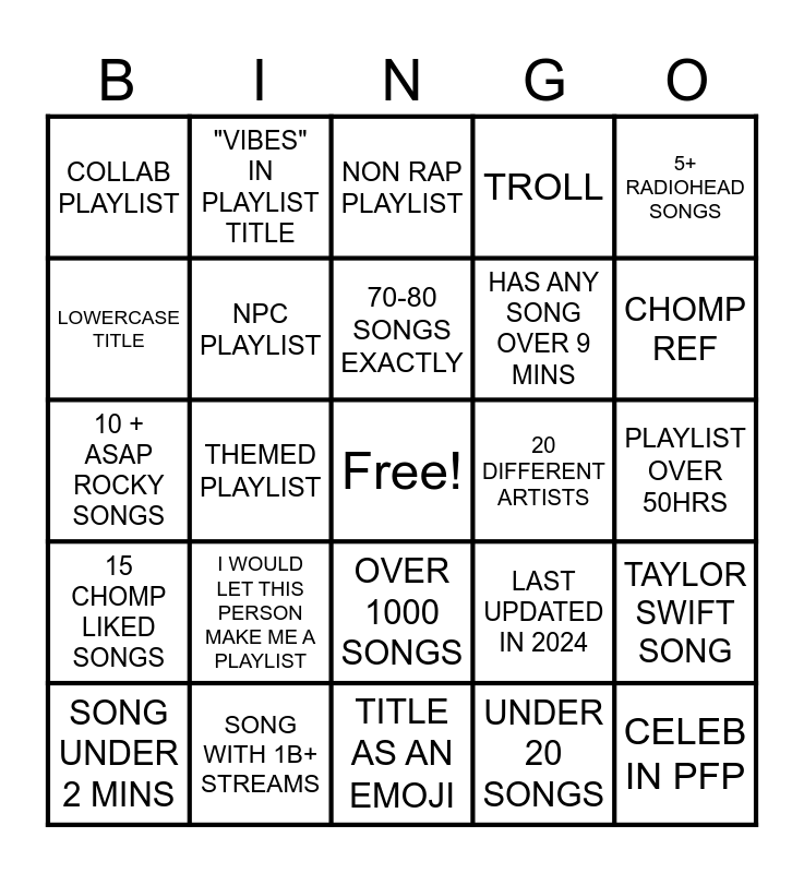 This bingo card has a free space and 24 words: I WOULD LET THIS PERSON MAKE ME A PLAYLIST, SONG WITH 1B+ STREAMS, 70-80 SONGS EXACTLY, SONG UNDER 2 MINS, 5+ RADIOHEAD SONGS, COLLAB PLAYLIST, LOWERCASE TITLE, "VIBES" IN PLAYLIST TITLE, 20 DIFFERENT ARTISTS, OVER 1000 SONGS, HAS ANY SONG OVER 9 MINS, 10 + ASAP ROCKY SONGS, LAST UPDATED IN 2024, TAYLOR SWIFT SONG, NPC PLAYLIST, UNDER 20 SONGS, PLAYLIST OVER 50HRS, NON RAP PLAYLIST, CHOMP REF, THEMED PLAYLIST, CELEB IN PFP, 15 CHOMP LIKED SONGS, TROLL and TITLE AS AN EMOJI.