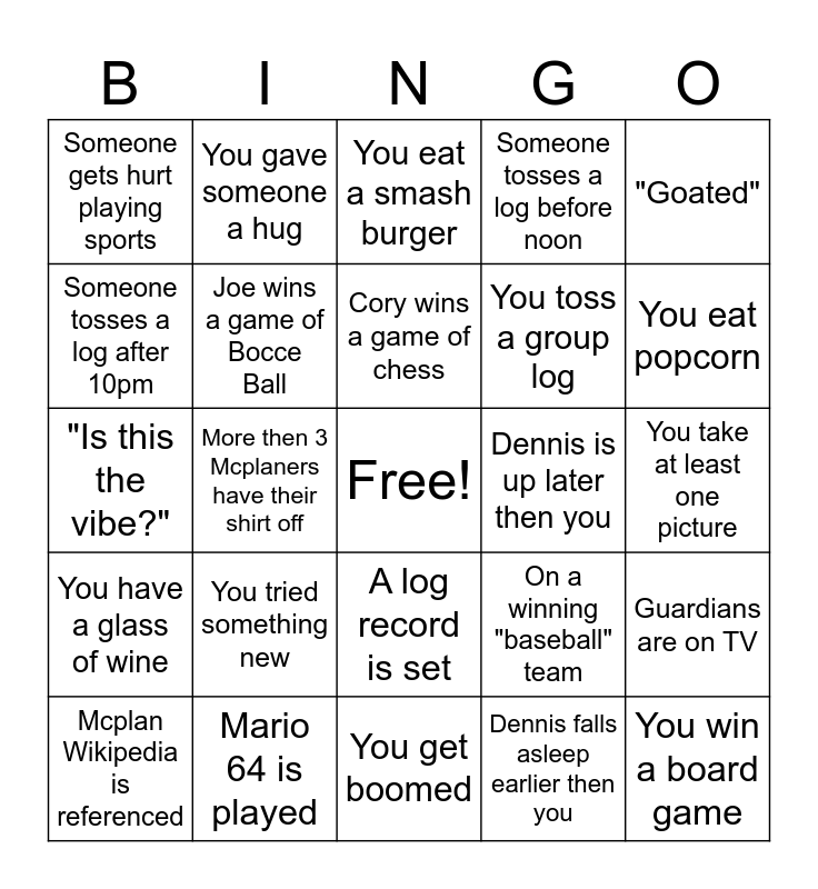 This bingo card has a free space and 35 words: Chris has a cup of coffee before you wake up, Steve falls asleep on the floor, "Which Mcplan", Joe wins a game of Bocce Ball, A log record is set, Someone tosses a log before noon, Someone tosses a log after 10pm, Someone throws up, Cory wins a game of chess, Super Smash Bros is played, "Is this the vibe?", "Goated", Star Fox 64 quote, Someone goes for a run, Someone gets hurt playing sports, Dennis is up later then you, Dennis falls asleep earlier then you, More then 3 Mcplaners have their shirt off, You have a glass of wine, You win a board game, On a winning "baseball" team, Mcplan Wikipedia is referenced, Guardians are on TV, Mario 64 is played, You eat a smash burger, You eat popcorn, You spot a cat/dog, "Has Mcplan gone too far", You toss a group log, You take at least one picture, Hungover, You get boomed, You tried something new, You gave someone a hug and You make it to 5PM Sunday.