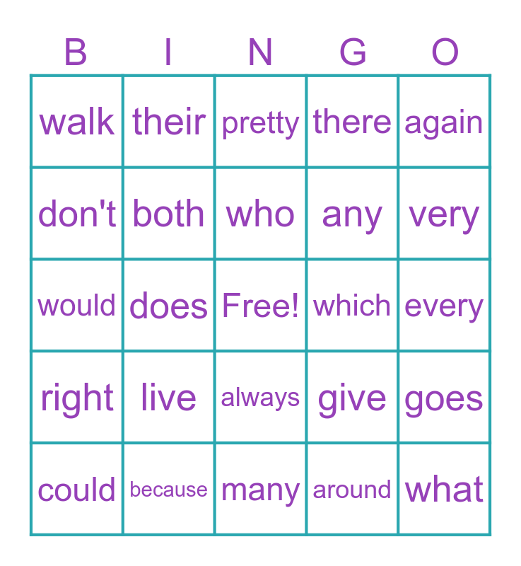 This bingo card has a free space and 24 words: live, because, who, could, again, walk, don't, their, which, always, any, would, give, goes, both, around, every, pretty, very, does, what, right, there and many.