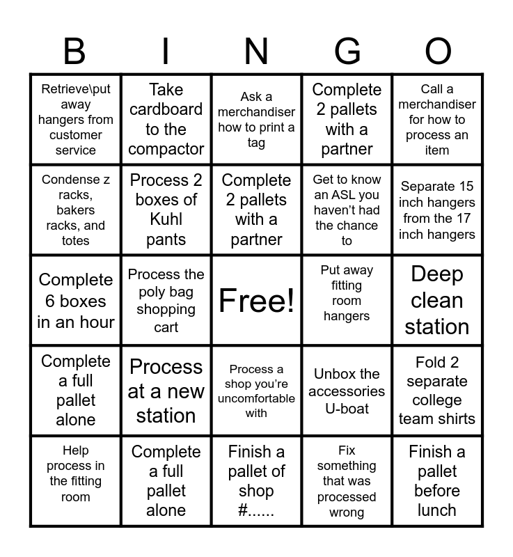 This bingo card has a free space and 24 words: Process at a new station, Complete a full pallet alone, Complete 2 pallets with a partner, Help process in the fitting room, Call a merchandiser for how to process an item, Retrieve\put away hangers from customer service, Condense z racks, bakers racks, and totes, Take cardboard to the compactor, Put away fitting room hangers, Process a shop you’re uncomfortable with, Get to know an ASL you haven’t had the chance to, Complete 6 boxes in an hour, Unbox the accessories U-boat, Fold 2 separate college team shirts, Process 2 boxes of Kuhl pants, Fix something that was processed wrong, Deep clean station, Ask a merchandiser how to print a tag, Separate 15 inch hangers from the 17 inch hangers, Process the poly bag shopping cart, Finish a pallet before lunch, Complete a full pallet alone, Complete 2 pallets with a partner and Finish a pallet of shop #.......