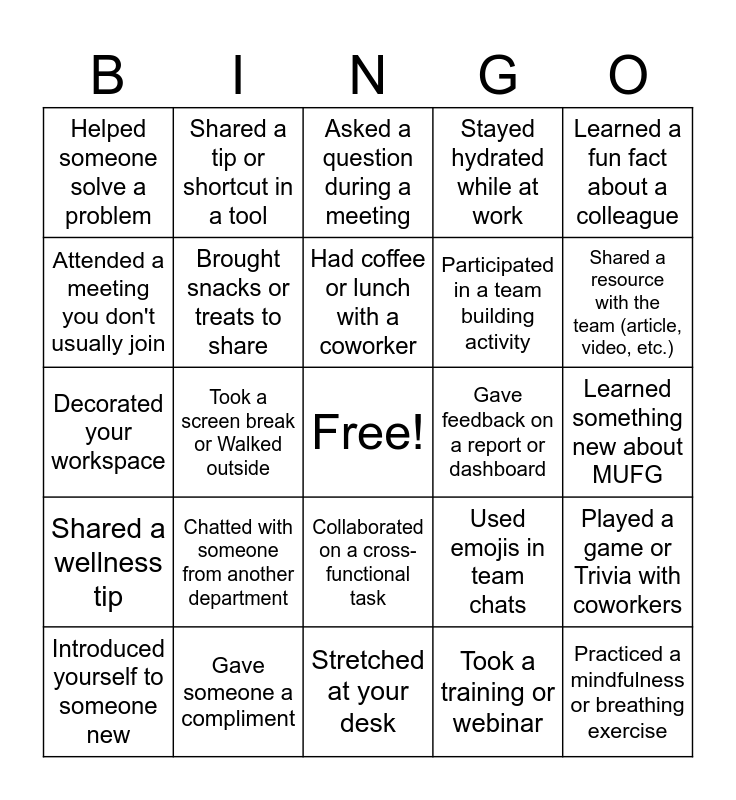 This bingo card has a free space and 24 words: Chatted with someone from another department, Gave someone a compliment, Had coffee or lunch with a coworker, Introduced yourself to someone new, Learned a fun fact about a colleague, Helped someone solve a problem, Attended a meeting you don't usually join, Shared a tip or shortcut in a tool, Gave feedback on a report or dashboard, Collaborated on a cross-functional task, Participated in a team building activity, Decorated your workspace, Used emojis in team chats, Played a game or Trivia with coworkers, Brought snacks or treats to share, Took a training or webinar, Learned something new about MUFG, Asked a question during a meeting, Shared a resource with the team (article, video, etc.), Took a screen break or Walked outside, Practiced a mindfulness or breathing exercise, Shared a wellness tip, Stayed hydrated while at work and Stretched at your desk.