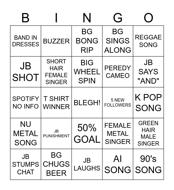 This bingo card has a free space and 24 words: JB PUNISHMENT, BG CHUGS BEER, BIG WHEEL SPIN, JB STUMPS CHAT, REGGAE SONG, BAND IN DRESSES, JB SHOT, BUZZER, 5 NEW FOLLOWERS, 50% GOAL, PEREDY CAMEO, SPOTIFY NO INFO, FEMALE METAL SINGER, GREEN HAIR MALE SINGER, SHORT HAIR FEMALE SINGER, AI SONG, K POP SONG, BG BONG RIP, JB SAYS "AND", T SHIRT WINNER, 90's SONG, NU METAL SONG, BG SINGS ALONG and JB LAUGHS.