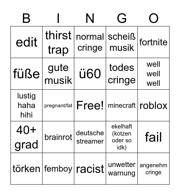This bingo card has a free space and 24 words: brainrot, femboy, ü60, törken, fortnite, edit, füße, thirst trap, minecraft, deutsche streamer, todes cringe, lustig haha hihi, ekelhaft (kotzen oder so idk), fail, gute musik, unwetter warnung, roblox, normal cringe, well well well, pregnant/fat, angenehm cringe, 40+ grad, scheiß musik and racist.