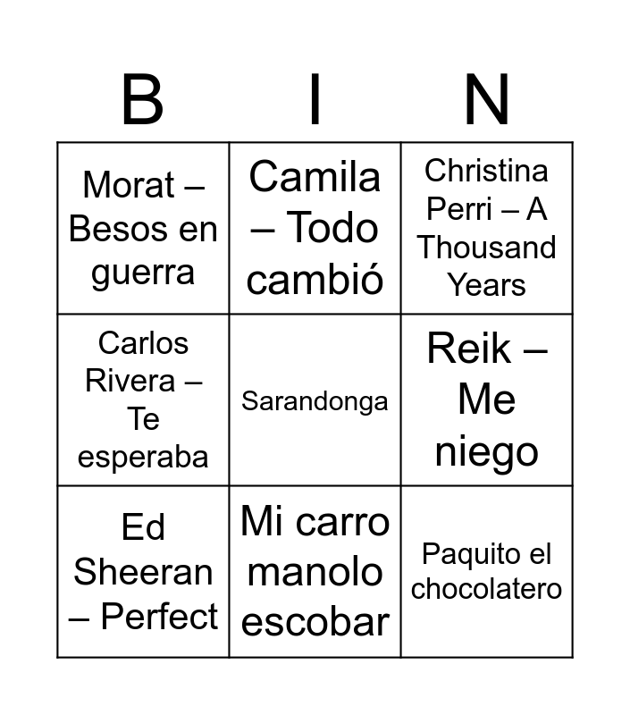 This bingo card has 9 words: Ed Sheeran – Perfect, Christina Perri – A Thousand Years, Camila – Todo cambió, Carlos Rivera – Te esperaba, Morat – Besos en guerra, Reik – Me niego, Sarandonga, Paquito el chocolatero and Mi carro manolo escobar.