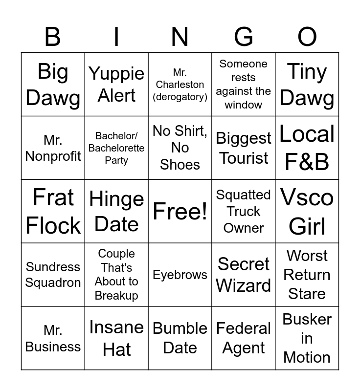 This bingo card has a free space and 24 words: Couple That's About to Breakup, Insane Hat, No Shirt, No Shoes, Mr. Business, Tiny Dawg, Big Dawg, Mr. Nonprofit, Yuppie Alert, Squatted Truck Owner, Eyebrows, Biggest Tourist, Frat Flock, Secret Wizard, Worst Return Stare, Bachelor/ Bachelorette Party, Federal Agent, Vsco Girl, Mr. Charleston (derogatory), Local F&B, Hinge Date, Busker in Motion, Sundress Squadron, Someone rests against the window and Bumble Date.