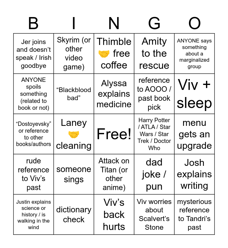 This bingo card has a free space and 24 words: someone sings, dictionary check, Alyssa explains medicine, Justin explains science or history / is walking in the wind, ANYONE says something about a marginalized group, Jer joins and doesn’t speak / Irish goodbye, ANYONE spoils something (related to book or not), Skyrim (or other video game), Harry Potter / ATLA / Star Wars / Star Trek / Doctor Who, Attack on Titan (or other anime), reference to AOOO / past book pick, “Dostoyevsky” or reference to other books/authors, dad joke / pun, Josh explains writing, “Blackblood bad”, Viv worries about Scalvert’s Stone, menu gets an upgrade, Thimble 🤝 free coffee, Viv + sleep, Laney 🤝 cleaning, mysterious reference to Tandri’s past, rude reference to Viv’s past, Amity to the rescue and Viv’s back hurts.