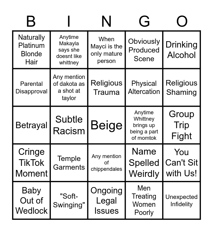 This bingo card has a free space and 24 words: Temple Garments, "Soft-Swinging", Religious Trauma, Baby Out of Wedlock, Drinking Alcohol, Naturally Platinum Blonde Hair, Parental Disapproval, Anytime Makayla says she doesnt like whittney, Anytime Whittney brings up being a part of momtok, Any mention of chippendales, Physical Altercation, Betrayal, Name Spelled Weirdly, You Can't Sit with Us!, Any mention of dakota as a shot at taylor, Men Treating Women Poorly, Group Trip Fight, When Mayci is the only mature person, Religious Shaming, Subtle Racism, Unexpected Infidelity, Cringe TikTok Moment, Obviously Produced Scene and Ongoing Legal Issues.