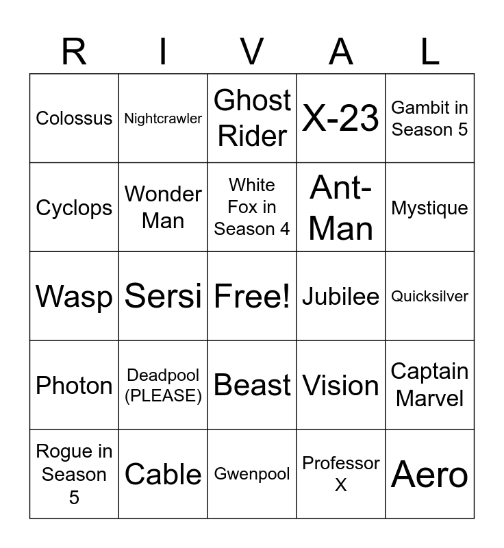 This bingo card has a free space and 24 words: Deadpool (PLEASE), Cable, White Fox in Season 4, Rogue in Season 5, Gambit in Season 5, Colossus, Cyclops, Nightcrawler, Jubilee, Beast, Ant-Man, Wasp, Vision, Captain Marvel, Wonder Man, Professor X, Quicksilver, Ghost Rider, Mystique, Sersi, Aero, Photon, X-23 and Gwenpool.