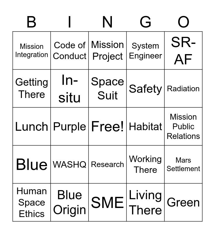 This bingo card has a free space and 30 words: Blue Origin, Exploration, Purple, System Manager, Mission Integration, Mission Project, In-situ, Research, Habitat, SME, Mission Public Relations, Green, Living There, Red, Radiation, Design Review, Working There, Blue, WASHQ, SR-AF, Lunch, Curiosity, Code of Conduct, Safety, Getting There, System Engineer, Mars Settlement, Human Space Ethics, Space Suit and Tour.