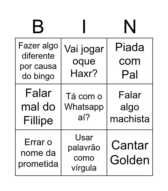 This bingo card has a free space and 8 words: Falar algo machista, Piada com Pal, Vai jogar oque Haxr?, Errar o nome da prometida, Fazer algo diferente por causa do bingo, Cantar Golden, Falar mal do Fillipe and Usar palavrão como vírgula.