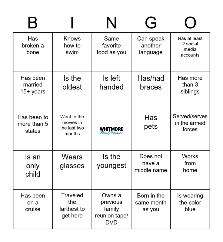 This bingo card has a free space and 24 words: Wears glasses, Traveled the farthest to get here, Is left handed, Has been on a cruise, Has at least 2 social media accounts, Has broken a bone, Has been married 15+ years, Knows how to swim, Has pets, Is the youngest, Has/had braces, Has been to more than 5 states, Does not have a middle name, Works from home, Is the oldest, Born in the same month as you, Served/serves in the armed forces, Same favorite food as you, Has more than 3 siblings, Went to the movies in the last two months, Is wearing the color blue, Is an only child, Can speak another language and Owns a previous family reunion tape/ DVD.