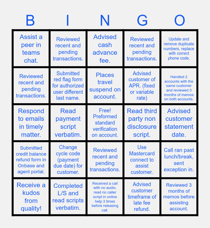 This bingo card has a free space and 29 words: Reviewed recent and pending transactions., Completed L/S and read scripts verbatim., Advised cash advance fee., ACW under 10 seconds for the day., Update and remove duplicate numbers, replace with correct phone code., Assist a peer in teams chat., Submitted red flag form for authorized user different last name., Places travel suspend on account., Read third party non disclosure script., Call ran past lunch/break, sent exception in., Receive a kudos from quality!, Read payment script verbatim., Advised customer timeframe of late fee refund., Reviewed 3 months of memos before assisting account., Respond to emails in timely matter., De-escalated a situation with a customer using magic phrases., Received a call with no audio, read no caller script in online help 3 times before releasing call., Use Mastercard connect to assist customer., Handled 2 accounts with the same customer and reviewed 3 months of memos on both accounts., Submitted credit balance refund form in Onbase and agent portal., Change cycle code (payment due date) for customer., Processed card order to alternate address., Advised customer of APR. (fixed or variable rate), Advised customer statement date., Reviewed recent and pending transactions., Reviewed recent and pending transactions., Reviewed recent and pending transactions., Reviewed recent and pending transactions. and Reviewed recent and pending transactions..