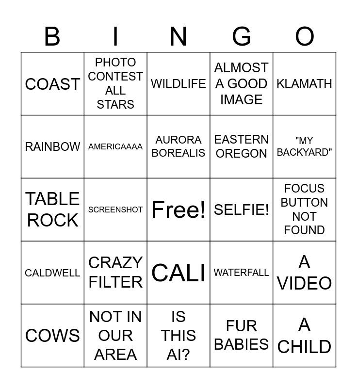 This bingo card has a free space and 29 words: COWS, SUNSET, SCREENSHOT, GONE FISHIN', COAST, WILDLIFE, AMERICAAAA, CRAZY FILTER, SELFIE!, NOT IN OUR AREA, FOCUS BUTTON NOT FOUND, A CHILD, IS THIS AI?, FUR BABIES, "MY BACKYARD", CRATER LAKE, CALI, CALDWELL, KLAMATH, TABLE ROCK, WATERFALL, UMPQUA, EASTERN OREGON, RAINBOW, ALMOST A GOOD IMAGE, PHOTO CONTEST ALL STARS, A VIDEO, AURORA BOREALIS and MISUNDERSTOOD THE ASSIGNMENT.