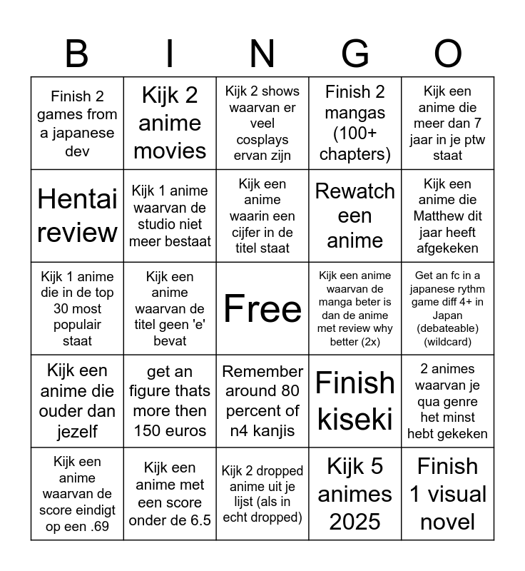This bingo card has a free space and 24 words: get an figure thats more then 150 euros, Kijk een anime met een score onder de 6.5, Kijk een anime waarin een cijfer in de titel staat, Kijk een anime waarvan de score eindigt op een .69, Kijk een anime die meer dan 7 jaar in je ptw staat, Finish 2 games from a japanese dev, Hentai review, Kijk 2 anime movies, Kijk een anime waarvan de manga beter is dan de anime met review why better (2x), Remember around 80 percent of n4 kanjis, Rewatch een anime, Kijk 1 anime die in de top 30 most populair staat, Finish kiseki, 2 animes waarvan je qua genre het minst hebt gekeken, Kijk 1 anime waarvan de studio niet meer bestaat, Kijk 5 animes 2025, Get an fc in a japanese rythm game diff 4+ in Japan (debateable)(wildcard), Kijk 2 shows waarvan er veel cosplays ervan zijn, Kijk een anime die Matthew dit jaar heeft afgekeken, Kijk een anime waarvan de titel geen 'e' bevat, Finish 1 visual novel, Kijk een anime die ouder dan jezelf, Finish 2 mangas (100+ chapters) and Kijk 2 dropped anime uit je lijst (als in echt dropped).
