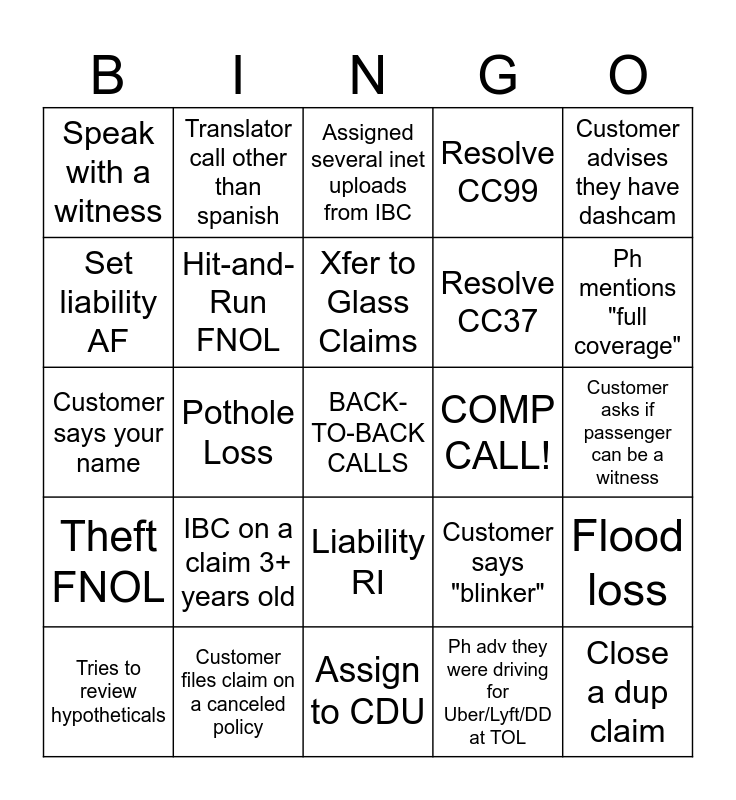 This bingo card has a free space and 34 words: "They came out of no where...", Ph adv they were driving for Uber/Lyft/DD at TOL, Ph hit a Tessy, Caller asks to speak w/ a specific ICS adjuster, Theft FNOL, Hit-and-Run FNOL, Customer advises they have dashcam, Tries to review hypotheticals, Translator call other than spanish, SOMOS call, Xfer to Glass Claims, Assigned several inet uploads from IBC, Double GEICO, Refer to SIU, COMP CALL!, Ph mentions "full coverage", Customer files claim on a canceled policy, Customer says your name, IBC on a claim 3+ years old, Customer says "blinker", Liability RI, Coverage RI, Speak with a witness, Customer asks if passenger can be a witness, Assign to CDU, Close a dup claim, Resolve CC99, Resolve CC33, Resolve CC37, Set liability AF, Set liability NAF, Pothole Loss, Flood loss and Ph AF for swerving to avoid.