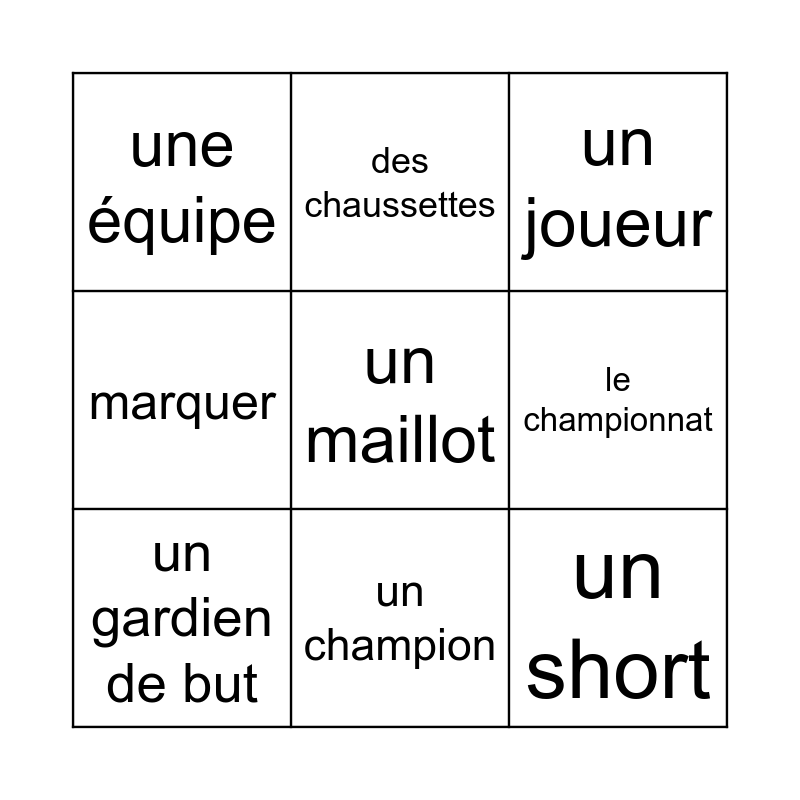 This bingo card has a free space and 17 words: le football, un ballon, un joueur, une équipe, gagner, marquer, un but, un gardien de but, un champion, le championnat, jouer, l'Euro 2025, un short, des chaussettes, rouge, vert and jaune.
