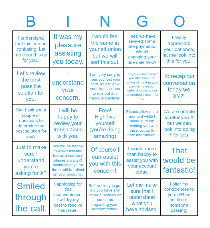 This bingo card has a free space and 24 words: Smiled through the call., We will be happy to waive this late fee as a courtesy please allow 2-3 business days for the credit to reflect on your account ., I am very sorry to hear you lost your card, let’s review your transactions to rule out any fraudulent activity., Let me make sure that I understand what you have advised., I really appreciate your patience, let me look into this for you., I understand that this can be confusing. Let me clear this up for you.., It was my pleasure assisting you today., I would feel the same in your situation but we will sort this out., Please allow me a moment while I make sure I’m providing you with the most up to date information., We are unable to offer you X but we can look into doing Y for you., Can I ask you a couple of questions to determine the best solution for you?, I understand your concern., I would more than happy to assist you with your account today., That would be fantastic!, Let’s review the best possible solution for you., I apologize for this inconvenience. I will try my best to resolve this issue., Before I let you go, did you have any other questions or concerns regarding your account today?, I see we have revived some late payments. Would changing your due date help?, To recap our conversation today we XYZ., Just to make sure I understand you’re asking for X?, I will be happy to review your transactions with you., Of course I can assist you with this concern!, For your convenience you also have the option of making your payments on our website or using our automated system for free. and I offer my condolences to you. (When notified of someone passing).