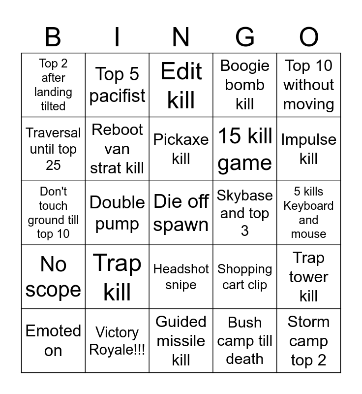 This bingo card has a free space and 24 words: Emoted on, Trap kill, Pickaxe kill, Bush camp till death, Top 10 without moving, Top 2 after landing tilted, Top 5 pacifist, Edit kill, Skybase and top 3, 5 kills Keyboard and mouse, Don't touch ground till top 10, Reboot van strat kill, Shopping cart clip, Trap tower kill, Traversal until top 25, Victory Royale!!!, Guided missile kill, Boogie bomb kill, Impulse kill, No scope, Double pump, Headshot snipe, 15 kill game and Storm camp top 2.