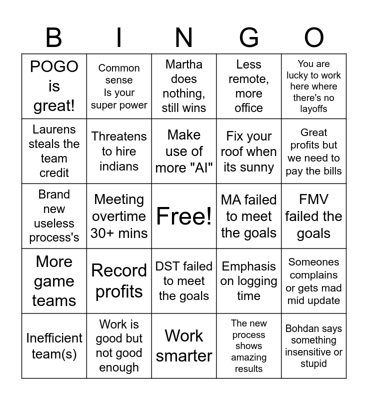 This bingo card has a free space and 24 words: Record profits, Work is good but not good enough, Make use of more "AI", Inefficient team(s), You are lucky to work here where there's no layoffs, POGO is great!, Laurens steals the team credit, Common sense Is your super power, MA failed to meet the goals, DST failed to meet the goals, Fix your roof when its sunny, Brand new useless process's, Emphasis on logging time, Someones complains or gets mad mid update, Threatens to hire indians, The new process shows amazing results, FMV failed the goals, Martha does nothing, still wins, Great profits but we need to pay the bills, Meeting overtime 30+ mins, Bohdan says something insensitive or stupid, More game teams, Less remote, more office and Work smarter.