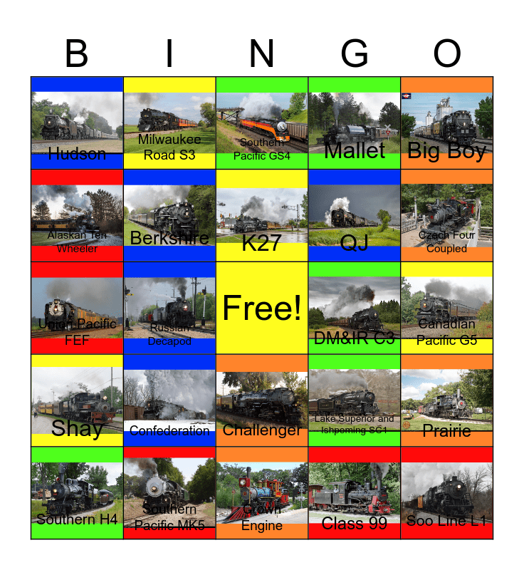 This bingo card has 24 images, a free space and 24 words: Confederation, Southern Pacific MK5, K27, Southern H4, Big Boy, Hudson, Alaskan Ten Wheeler, Milwaukee Road S3, DM&IR C3, Challenger, QJ, Union Pacific FEF, Lake Superior and Ishpeming SC1, Prairie, Berkshire, Class 99, Canadian Pacific G5, Southern Pacific GS4, Czech Four Coupled, Russian Decapod, Soo Line L1, Shay, Mallet and Crown Engine.