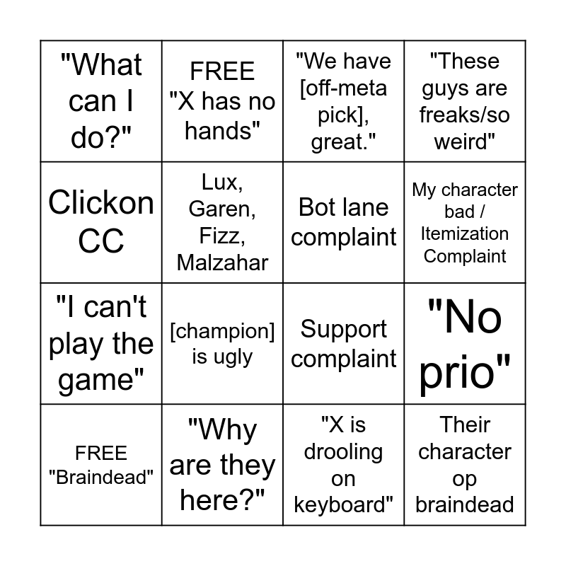 This bingo card has 16 words: "Why are they here?", "No prio", "We have [off-meta pick], great.", "What can I do?", "I can't play the game", FREE "X has no hands", Support complaint, "X is drooling on keyboard", Clickon CC, Lux, Garen, Fizz, Malzahar, FREE "Braindead", "These guys are freaks/so weird", [champion] is ugly, My character bad / Itemization Complaint, Bot lane complaint and Their character op braindead.