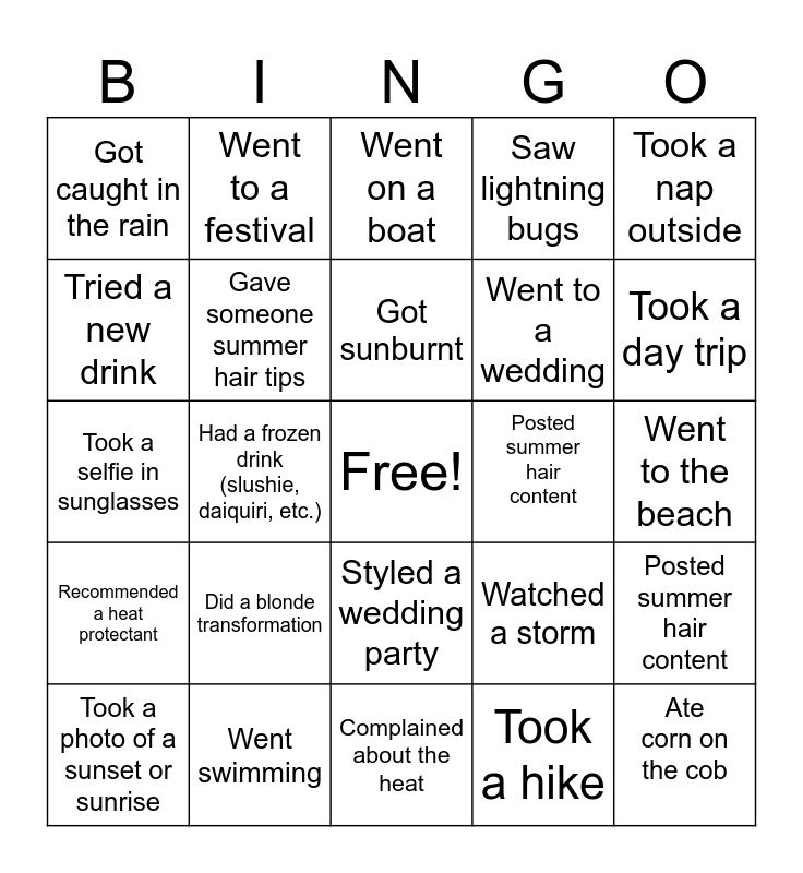 This bingo card has a free space and 24 words: Did a blonde transformation, Went swimming, Got sunburnt, Took a photo of a sunset or sunrise, Took a nap outside, Got caught in the rain, Tried a new drink, Went to a festival, Posted summer hair content, Styled a wedding party, Went to a wedding, Took a selfie in sunglasses, Watched a storm, Posted summer hair content, Gave someone summer hair tips, Took a hike, Went to the beach, Went on a boat, Took a day trip, Had a frozen drink (slushie, daiquiri, etc.), Ate corn on the cob, Recommended a heat protectant, Saw lightning bugs and Complained about the heat.
