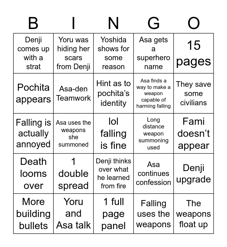 This bingo card has a free space and 24 words: 1 double spread, Yoru and Asa talk, Hint as to pochita’s identity, More building bullets, 15 pages, Denji comes up with a strat, Pochita appears, Yoru was hiding her scars from Denji, Long distance weapon summoning used, Denji thinks over what he learned from fire, Asa finds a way to make a weapon capable of harming falling, Falling is actually annoyed, Asa continues confession, Denji upgrade, Asa-den Teamwork, Falling uses the weapons, Fami doesn’t appear, Yoshida shows for some reason, They save some civilians, Asa uses the weapons she summoned, The weapons float up, Death looms over, Asa gets a superhero name and 1 full page panel.