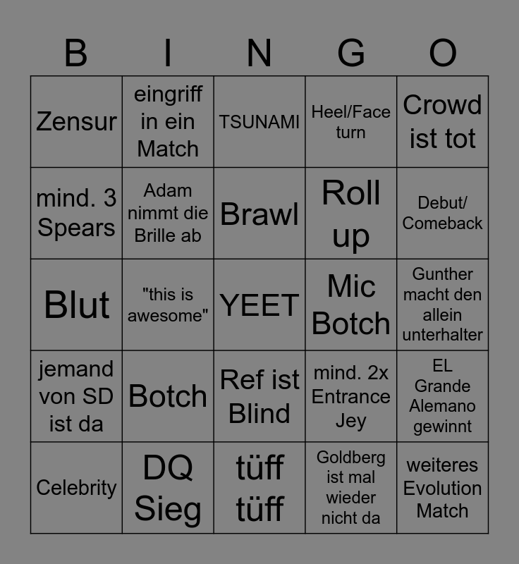 This bingo card has a free space and 24 words: Botch, DQ Sieg, Brawl, Celebrity, Crowd ist tot, Zensur, mind. 3 Spears, eingriff in ein Match, Mic Botch, Ref ist Blind, Roll up, Blut, mind. 2x Entrance Jey, EL Grande Alemano gewinnt, Adam nimmt die Brille ab, Goldberg ist mal wieder nicht da, Gunther macht den allein unterhalter, TSUNAMI, Debut/ Comeback, "this is awesome", weiteres Evolution Match, jemand von SD ist da, Heel/Face turn and tüff tüff.