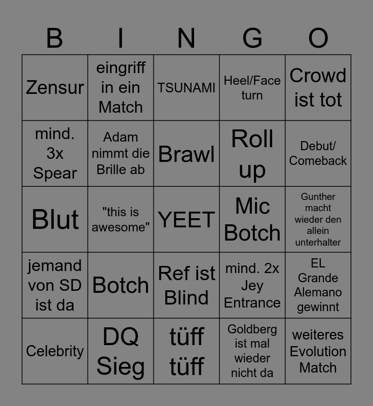 This bingo card has a free space and 24 words: Botch, DQ Sieg, Brawl, Celebrity, Crowd ist tot, Zensur, mind. 3x Spear, eingriff in ein Match, Mic Botch, Ref ist Blind, Roll up, Blut, mind. 2x Jey Entrance, EL Grande Alemano gewinnt, Adam nimmt die Brille ab, Goldberg ist mal wieder nicht da, Gunther macht wieder den allein unterhalter, TSUNAMI, Debut/ Comeback, "this is awesome", weiteres Evolution Match, jemand von SD ist da, Heel/Face turn and tüff tüff.