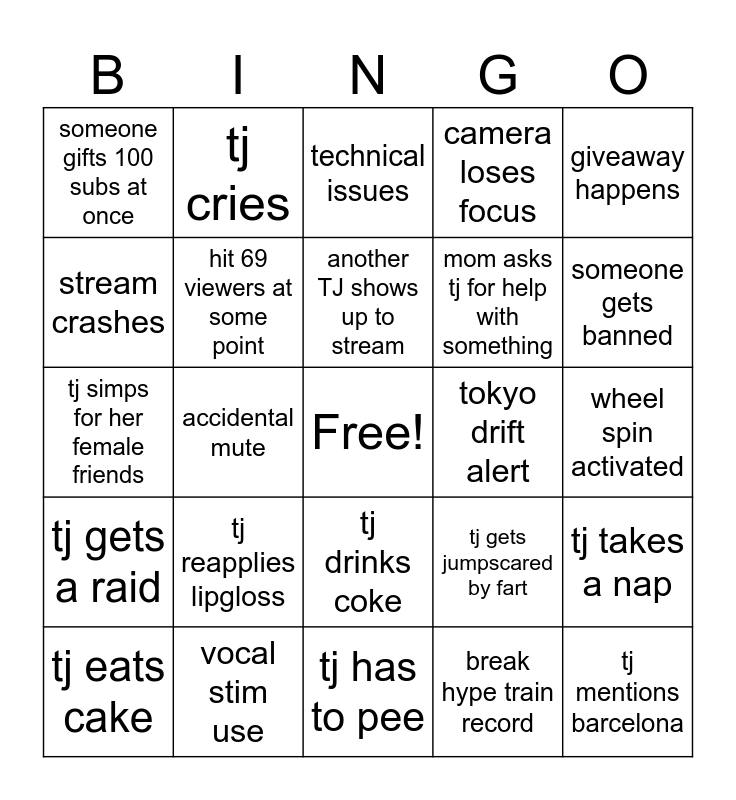 This bingo card has a free space and 31 words: tj has to pee, tj recreates the harry potter chess scene, accidental mute, dog appearance on stream, someone gifts 100 subs at once, technical issues, hit 69 viewers at some point, tj gets jumpscared by fart, tokyo drift alert, break hype train record, wheel spin activated, tj mentions barcelona, tj wins mario kart, tj attempts a british accent, someone gets banned, food break, tj takes a nap, tj reapplies lipgloss, tj gets a raid, tj drinks coke, giveaway happens, movie night redeem, tj eats cake, tj cries, mom asks tj for help with something, stream crashes, camera loses focus, tj simps for her female friends, vocal stim use, another TJ shows up to stream and tj says "im scared".