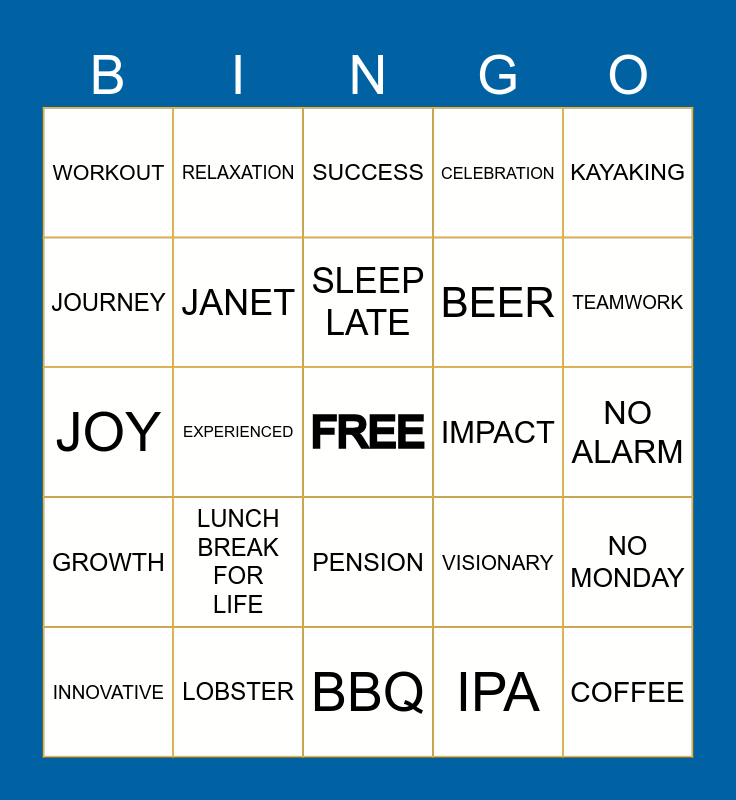 This bingo card has a free space and 89 words: 2025, SUSHI, PENSION, BAKING, 40 YEARS!, HIKING, READ, NO STRESS, NO TAXES, NO AGILE, NO BOSS, GOLF, NO MONDAY, NO ALARM, VISIT, SLEEP LATE, FREE TIME, NAP TIME, RETIREMENT, MILES, FRIENDS, DREAMS, BBQ, HOLIDAY, JOY, LOBSTER, LEGACY, ACHIEVEMENT, DEDICATED, MILESTONE, CELEBRATION, EXPERIENCED, WISDOM, WORKOUT, LEADERSHIP, SUCCESS, JOURNEY, COMMITTED, TEAMWORK, INNOVATIVE, GROWTH, INSPIRING, EXCELLENCE, COLLABORATION, VISIONARY, IMPACT, CONTRIBUTION, MEMORIES, FUTURE, RELAXATION, ADVENTURE, FREEDOM, TRAVEL, HOBBIES, FAMILY, FISHING, THE GYM, READING, VOLUNTEER, HEALTH, HAPPINESS, GRATITUDE, REFLECTION, NEW BEGINNINGS, FAREWELL, TOAST, PARTY, OFFICE, DESK, LUNCH BREAK FOR LIFE, COFFEE, CAMPING, LAND CRUISER, BEER, JANET, IPA, DOUBLE IPA, HAZY IPA, BACKPACKING, PINECREST, KAYAKING, ROAD TRIP, NEW ORLEANS, MARDI GRAS, PO-BOY, ETOUFFEE, CALI NATIVE, MECHANICAL and CAMPBELL.