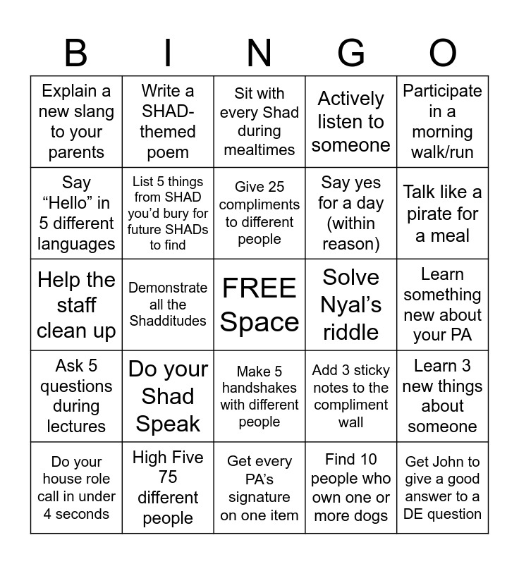 This bingo card has a free space and 24 words: Do your Shad Speak, High Five 75 different people, Give 25 compliments to different people, Do your house role call in under 4 seconds, Participate in a morning walk/run, Explain a new slang to your parents, Say “Hello” in 5 different languages, Write a SHAD-themed poem, Solve Nyal’s riddle, Make 5 handshakes with different people, Say yes for a day (within reason), Help the staff clean up, Add 3 sticky notes to the compliment wall, Learn 3 new things about someone, List 5 things from SHAD you’d bury for future SHADs to find, Find 10 people who own one or more dogs, Learn something new about your PA, Sit with every Shad during mealtimes, Talk like a pirate for a meal, Demonstrate all the Shadditudes, Get John to give a good answer to a DE question, Ask 5 questions during lectures, Actively listen to someone and Get every PA’s signature on one item.