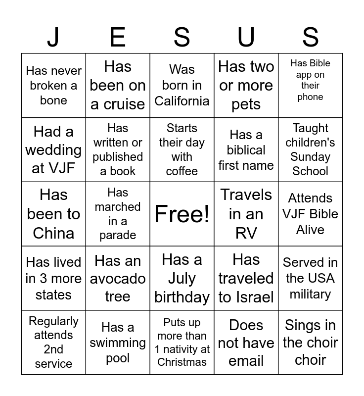 This bingo card has a free space and 29 words: Regularly attends 2nd service, Has seen a USA president in person, Has marched in a parade, Accepted Jesus as a child, Has never broken a bone, Was born in California, Has written or published a book, Has an avocado tree, Travels in an RV, Has a swimming pool, Attends VJF Bible Alive, Sings in the choir choir, Puts up more than 1 nativity at Christmas, Does not have email, Taught children's Sunday School, Has read the Bible through 2 + times, Has a July birthday, Has lived in 3 more states, Has Bible app on their phone, Has been to China, Has traveled to Israel, Is left handed, Has a biblical first name, Had a wedding at VJF, Has two or more pets, Has been on a cruise, Served in the USA military, Starts their day with coffee and Can name the four gospels.