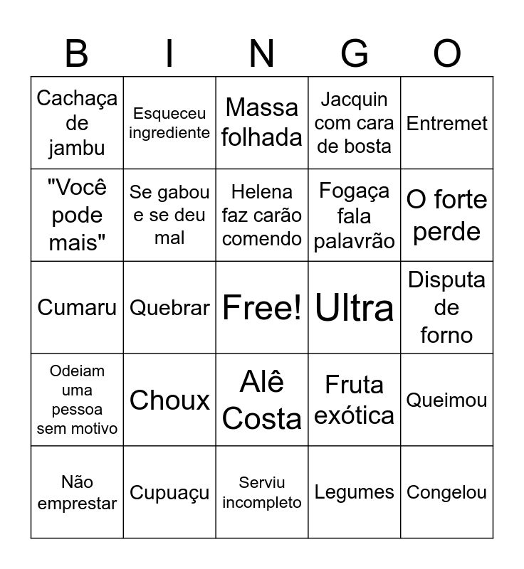 This bingo card has a free space and 24 words: Choux, Cupuaçu, Helena faz carão comendo, Não emprestar, Entremet, Cachaça de jambu, "Você pode mais", Esqueceu ingrediente, Ultra, Alê Costa, Fogaça fala palavrão, Cumaru, Fruta exótica, Queimou, Se gabou e se deu mal, Legumes, Disputa de forno, Massa folhada, O forte perde, Quebrar, Congelou, Odeiam uma pessoa sem motivo, Jacquin com cara de bosta and Serviu incompleto.