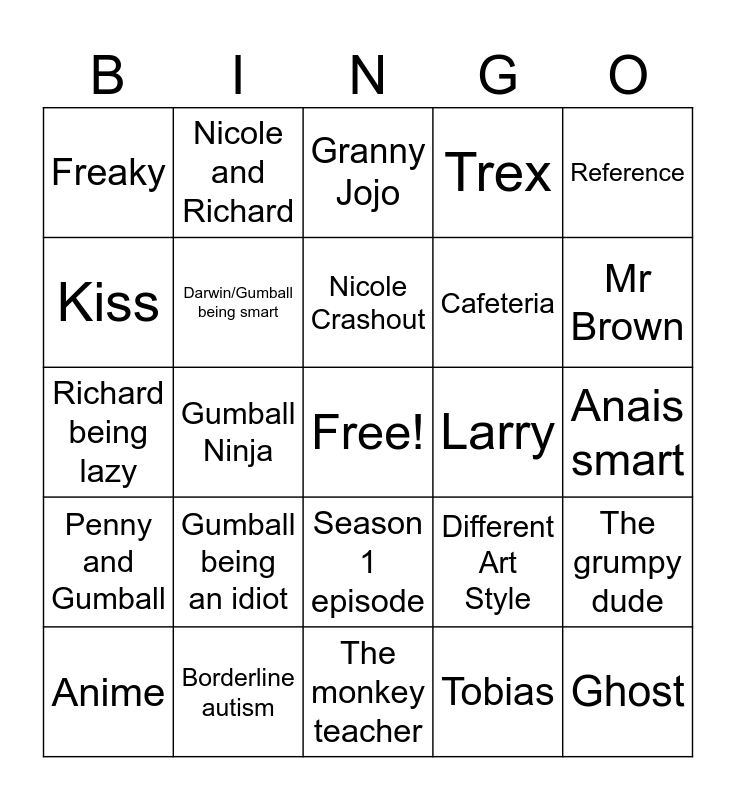 This bingo card has a free space and 24 words: Gumball being an idiot, Borderline autism, Nicole Crashout, Anime, Reference, Freaky, Kiss, Nicole and Richard, Larry, Season 1 episode, Cafeteria, Richard being lazy, Different Art Style, The grumpy dude, Darwin/Gumball being smart, Tobias, Anais smart, Granny Jojo, Mr Brown, Gumball Ninja, Ghost, Penny and Gumball, Trex and The monkey teacher.